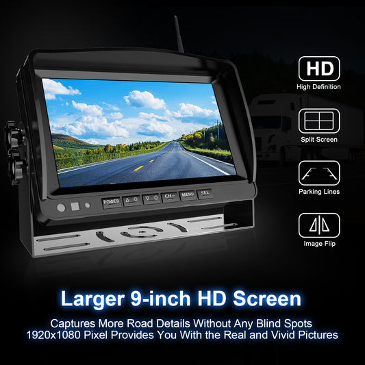 Fookoo 1080P 9" Wireless Backup Camera System Kit, 9" HD Quad Split Monitor with Recording, IP69 Waterproof Rear View Side View Cameras with Parking Lines, Universal for RV/Truck/Trailer/Van/Bus(D904)