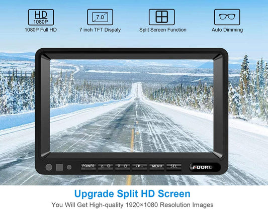 Fookoo Ⅱ HD 1080P Backup Camera System Kit,7'' DVR Dual Split Screen Monitor, IP69 Waterproof Rear View Camera for Truck/Semi-Trailer/Box Truck/RV, Sharp CCD Chip,100% Not Wash Up (FHD2-Wired)