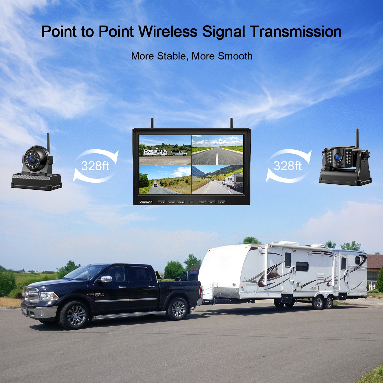 - Dual-antenna & 2.4GHZ Wireless Signal : Utilizing advanced 2.4GHz wireless signal technology and dual antenna design, it provides a more reliable and stable signal with no delay and no lag in images. With a reception range of up to 200ft in the open, it shows you your surroundings in real time, even at high speeds of 102 mph.Suits for car/SUV/camper/truck/voyager RV/jeep truck/pickup/horse trailer/fifth wheel/van/tractor/boat ect.