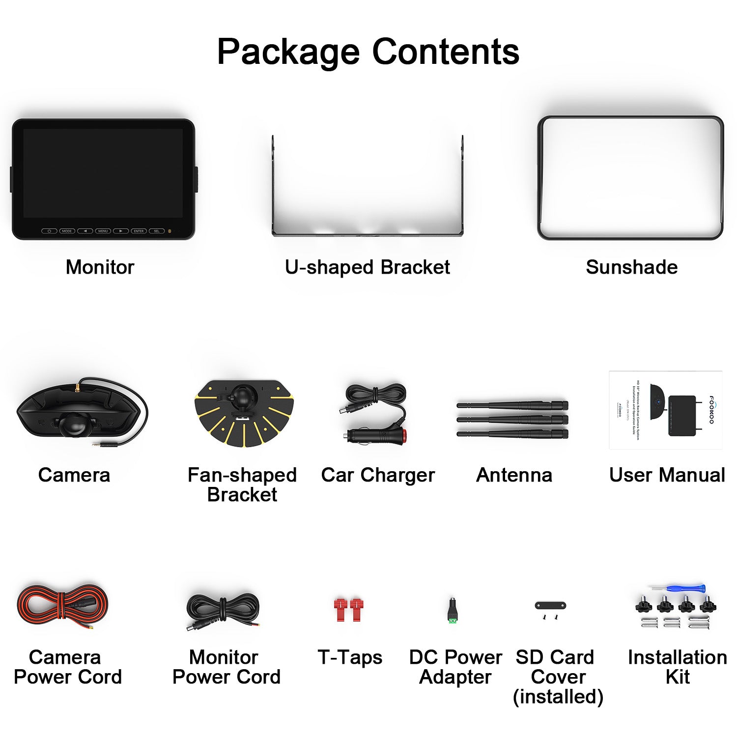 - Full HD Stunning Visuals: 10" IPS monitor provides with crisp images and parking lines. Equipped with touch buttons, a touch of the response, faster and more convenient operation. With auto-dimming, screen will automatically adjust the right brightness, night driving will not be affected. It can support up to 4 cameras for full coverage and display in dual/triple/quad split screen mode.