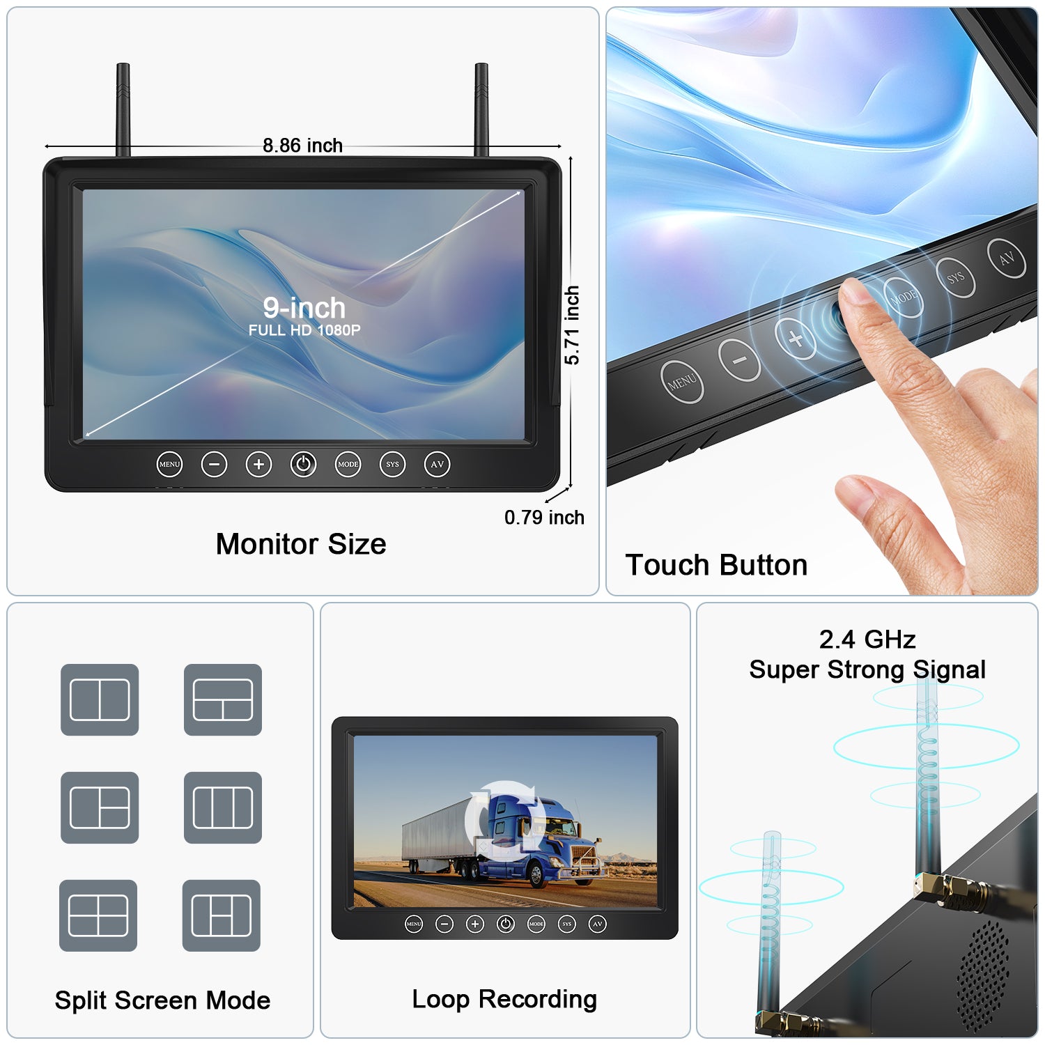 - 1080P 9-inch IPS Monitor & 8 Split-screen Modes : The 9" IPS monitor features a 1080P image processor that allows you to see images in 1920 x 1080 resolution with sharper detail, giving you more confidence and safety when driving and reversing. And it can display two, three and four cameras' image at the same time that reduced blind spots in the field of view.Optionally, you can mount it on the bench with a U-shaped bracket or fan-shaped bracket to suit your mounting needs.
