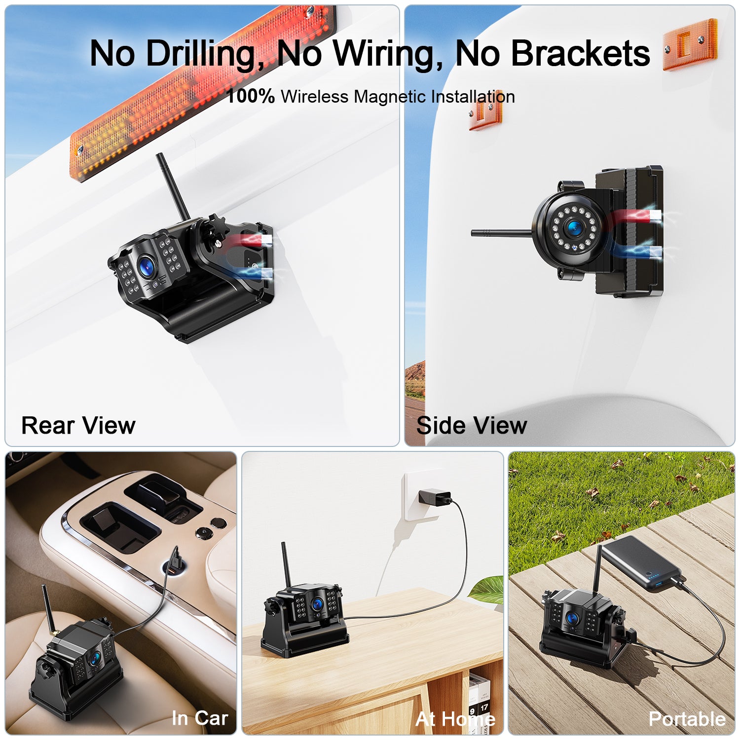 - 1-Min DIY Installation : With a strong magnetic base and built-in battery, this wireless backup camera can effortlessly adhere to any metallic surface without the need for drilling holes or routing wires on your vehicle. It offers true plug-and-play functionality, allowing for installation in just 1 minute. The magnetic base and built-in battery design also facilitate convenient removal and reinstallation of the wireless reverse camera on alternative vehicles or locations.