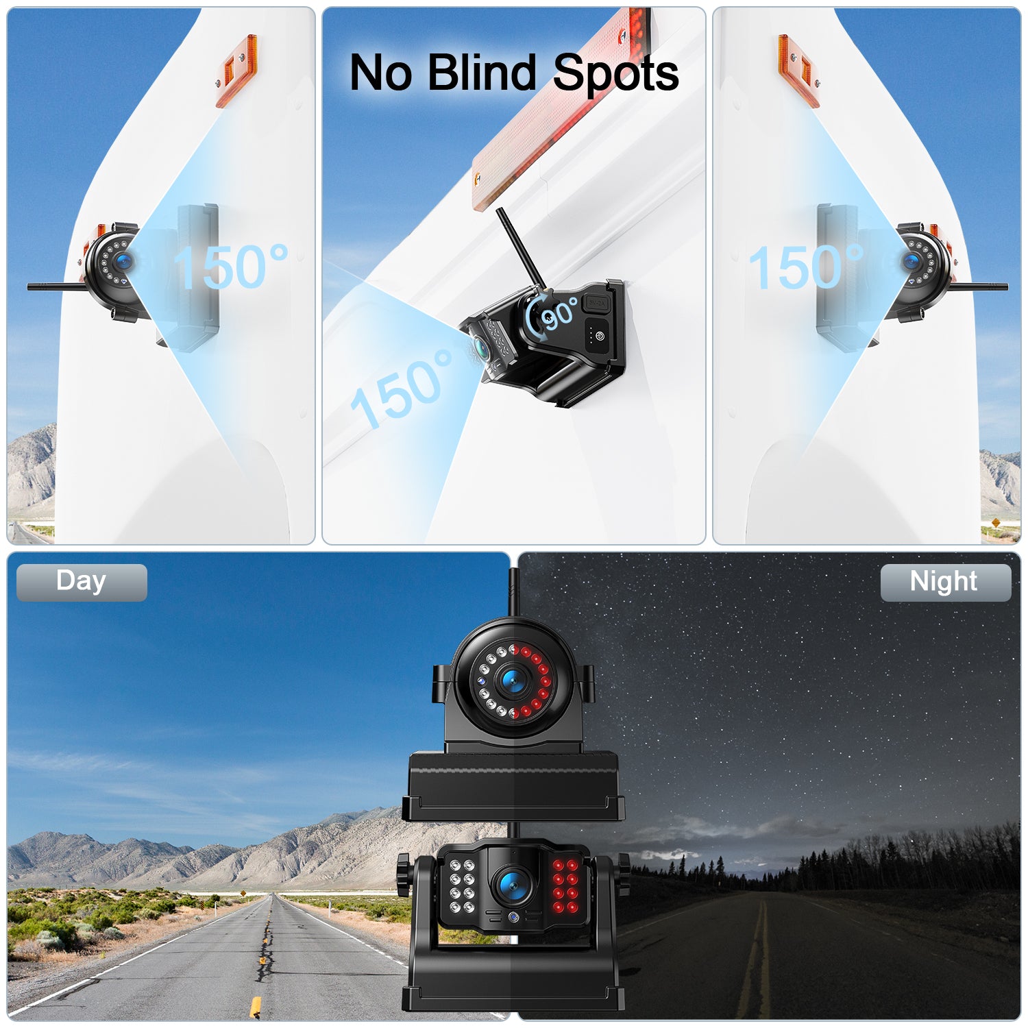 - IP69 Waterproof Camera with Night Vision : The HD camera with IP69 waterproof and 150-degree viewing angle brings you the best view and longer product life.The rear- view camera has 16 infrared lights, and the side-view camera has 15 infrared lights, and both have light sensors. When the ambient light is insufficient, the infrared lights will automatically turn on and continuously provide you with high-definition images to ensure driving safety.