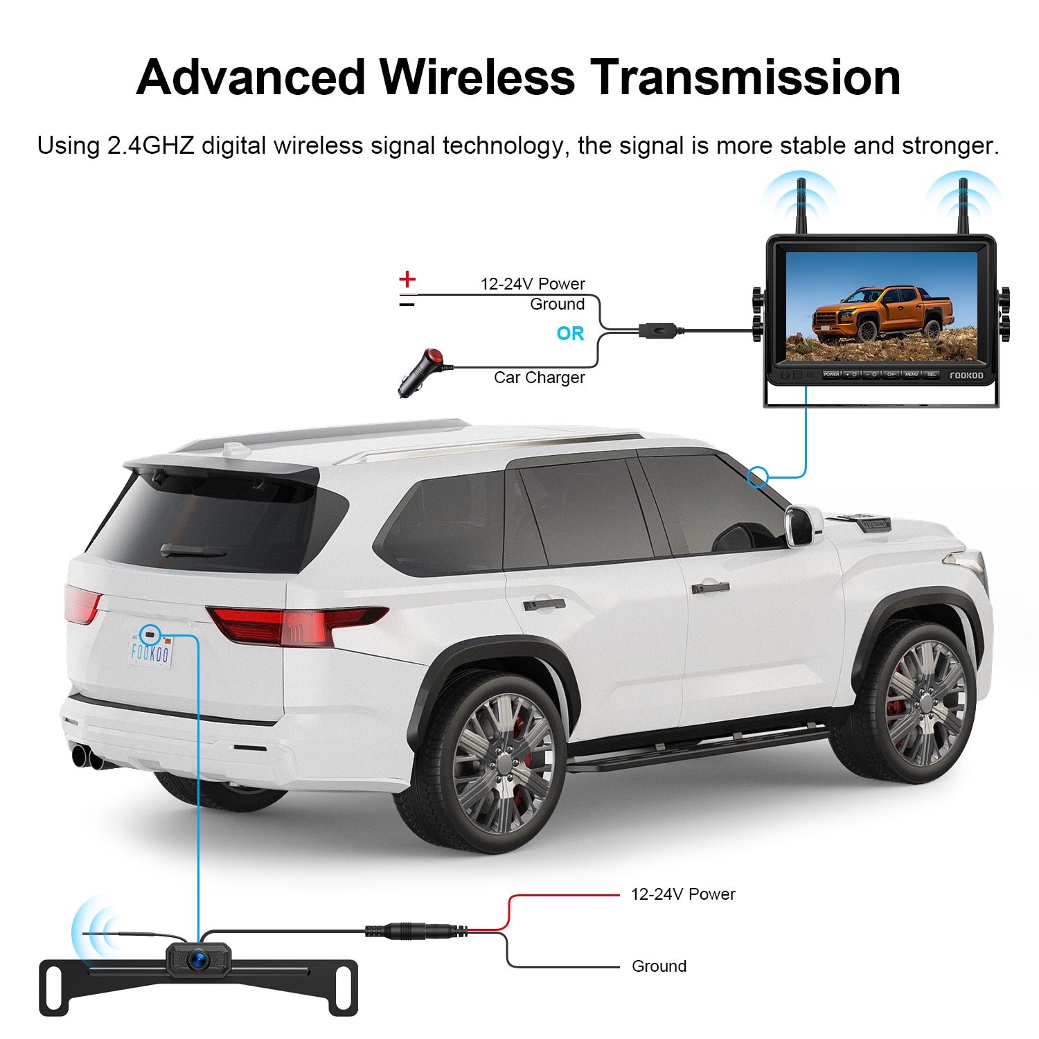 Fookoo HD 1080P 7-inch Wireless Backup Camera, 7" Split Screen Monitor + Rear View Licence Plate Camera, DIY Guide Lines Wide Angle IP69 Waterproof Easy to Install for Car Pickup Van SUV - DW7CT