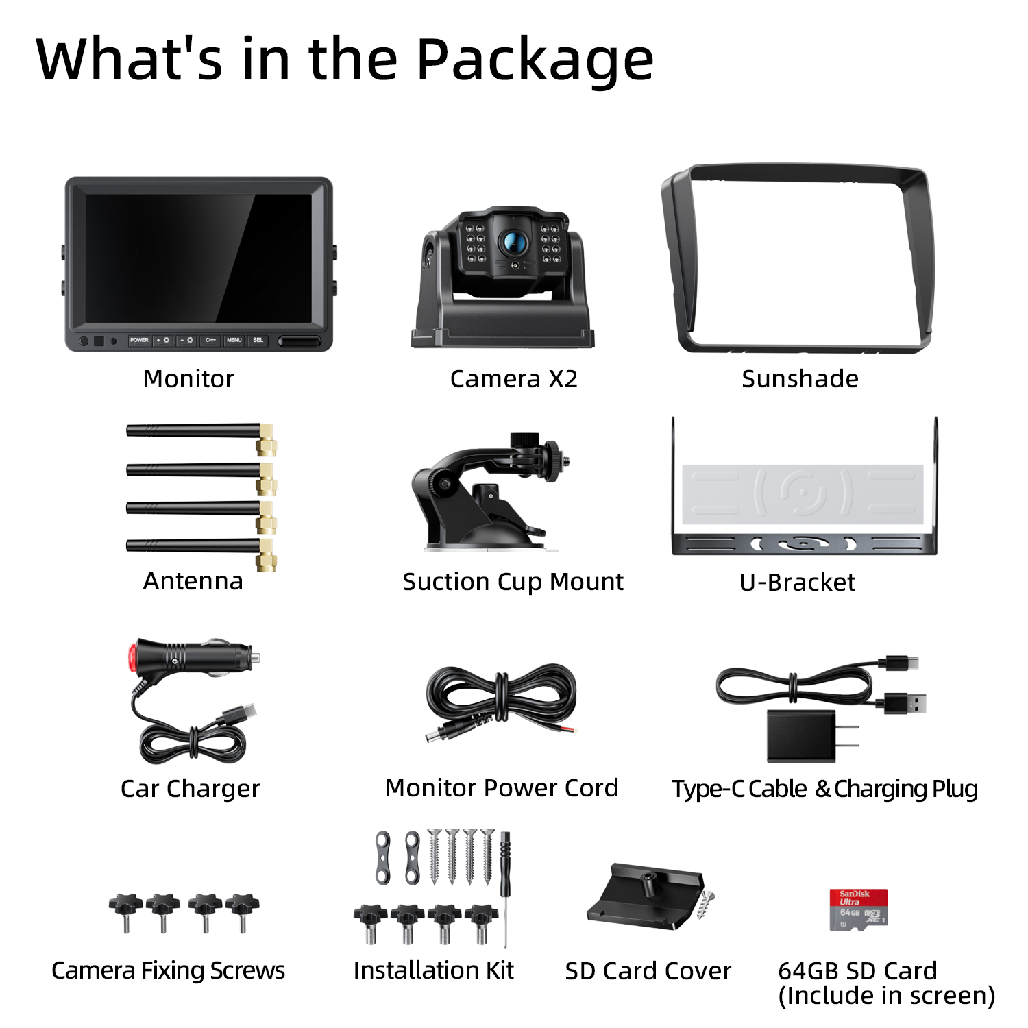 - Loop Record & Parking Assistance:With a Loop Recording function, the monitor can record your driving conditions, and the video may become your evidence if necessary. Parking Lines will make parking safer and faster. No more having to get out of your car to help you see the way or guide you. (Built-in 64GB SD card, support 64-128GB SD card)