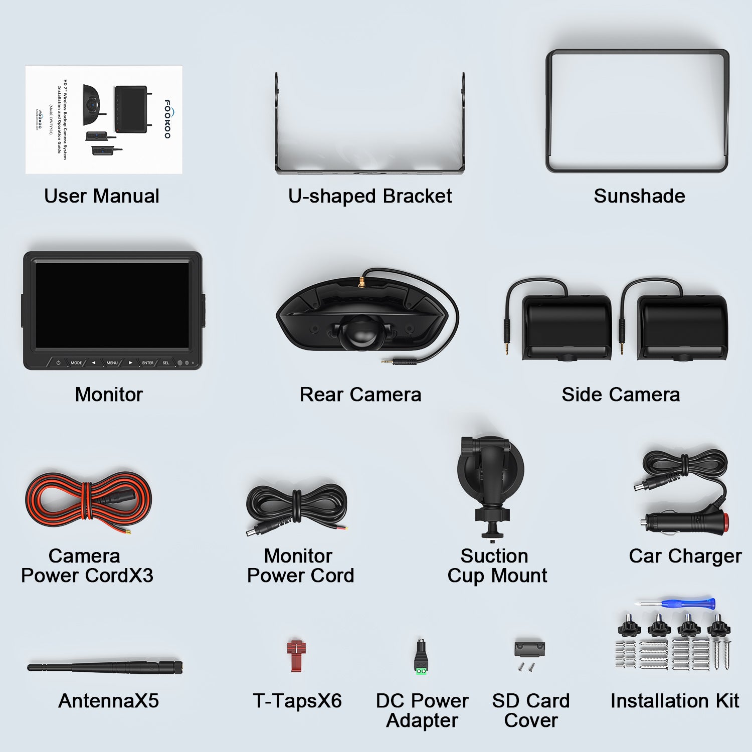 Fookoo HD Wireless RV Backup Cameras System, 7" Split-Screen Monitor, 1 Rear View + 2 Side Cameras, IR Night Vision Recording Waterproof Compatible with Furrion Pre-Wired RV Truck Trailer - DW7Y503